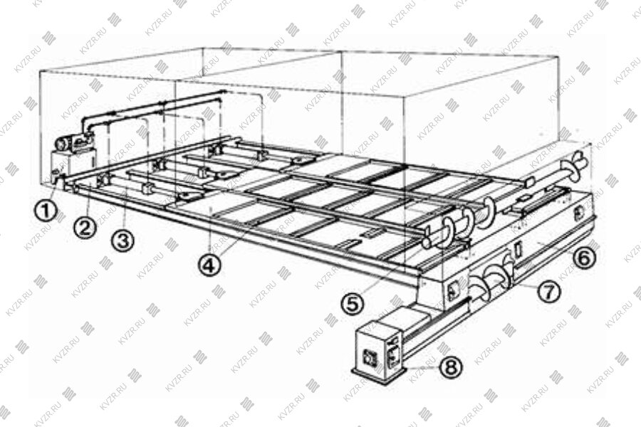 В зависимости от проекции расположения гидропривода гидроцилиндры-толкатели двигаются по полу склада возвратно-поступательно. Когда толкатель находится в конечном положении, происходит возрастание давления и толкатель автоматически начинает движение назад. Так работает вся система толкателей, чередуя движение групп толкателей взад-вперед попеременно.