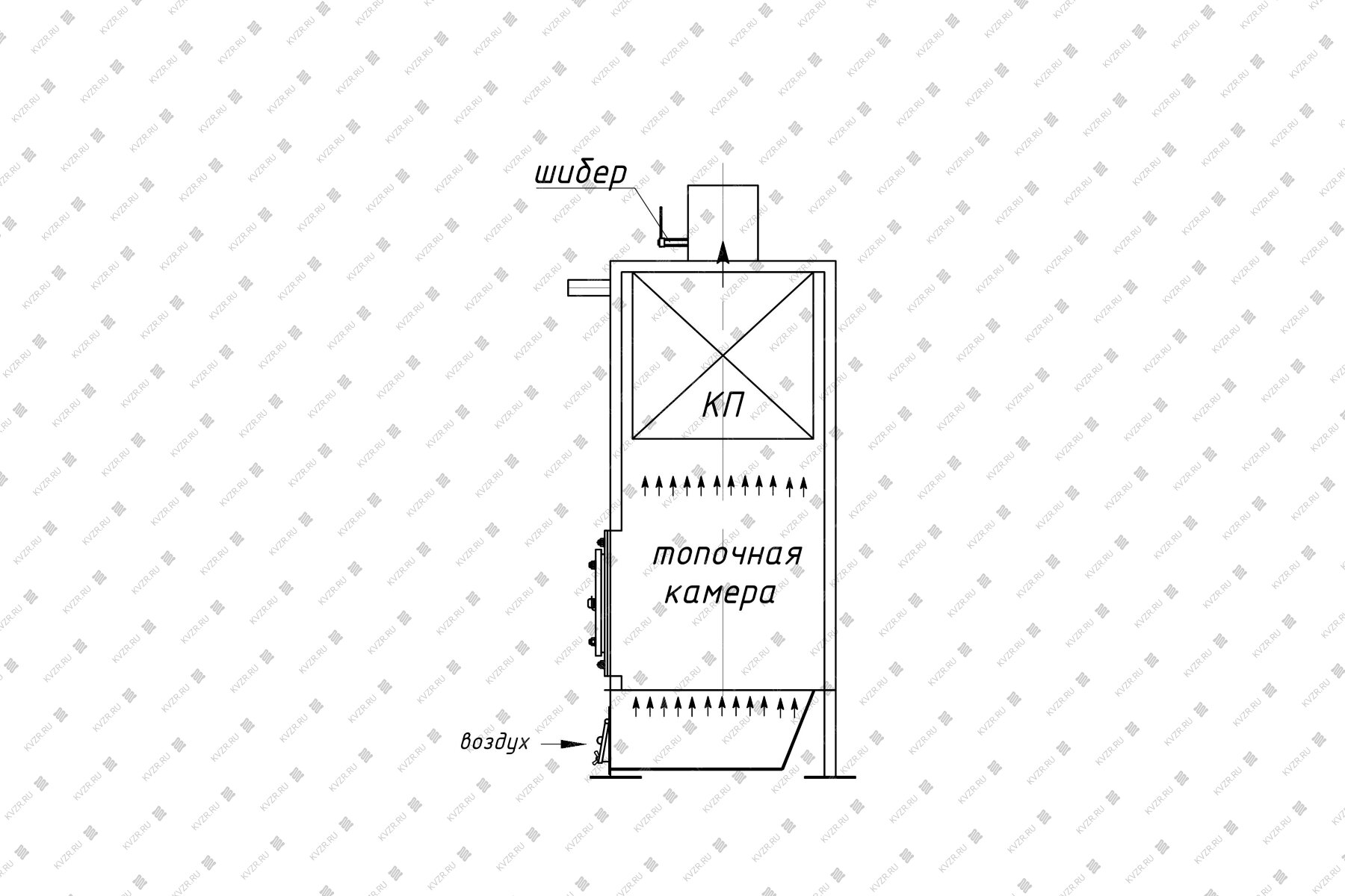 Подвод воздуха в водогрейный котел КВр 0.15 МВт осуществляется за счет разряжения в топке, путем подсоса через дверку - заслонку в зольный короб под колосниковую решетку.