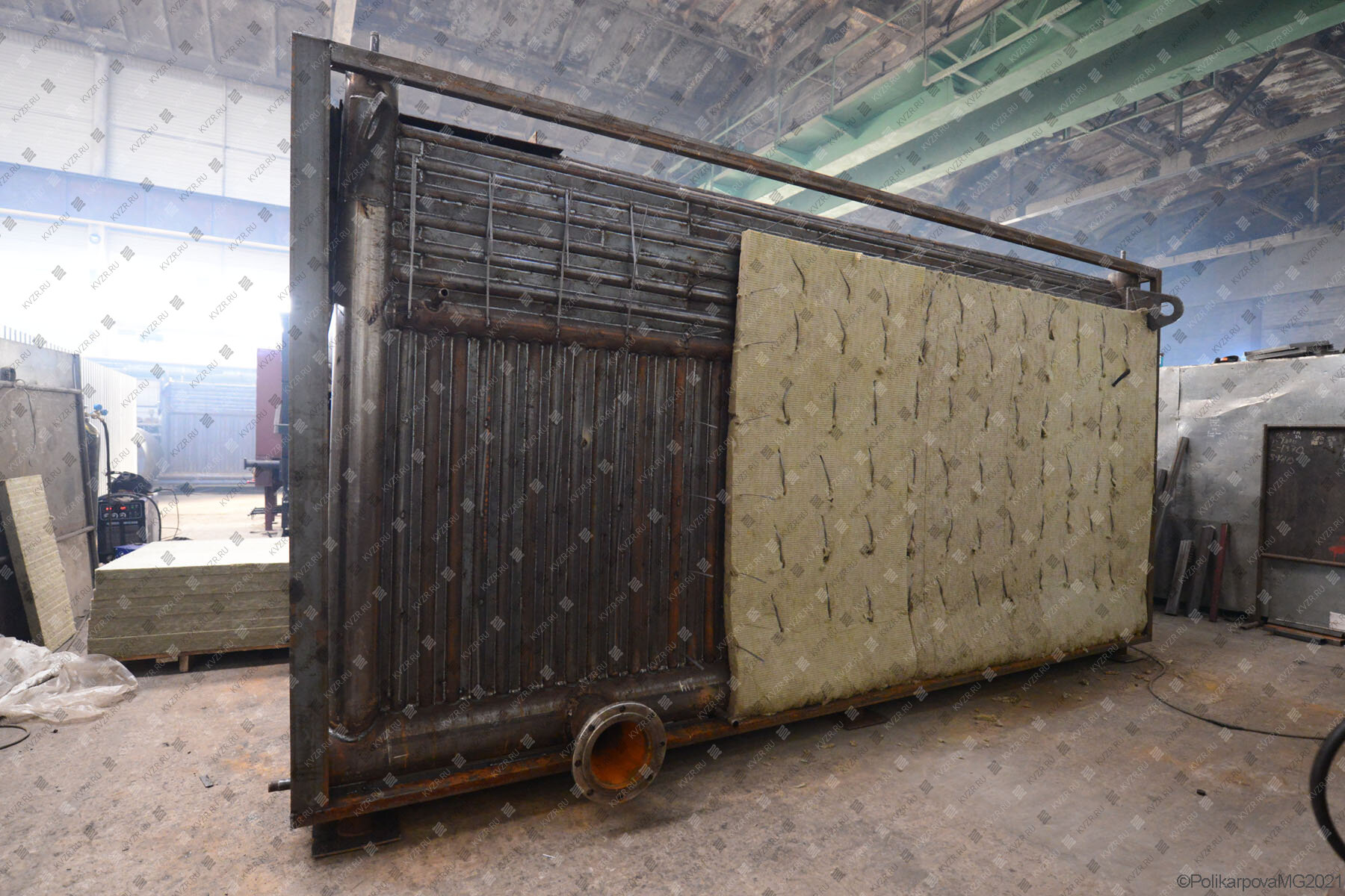 Конвективная часть котла представляет собой ряд стальных труб, вваренных в раздающие и собирающие стояки. В этой части происходит нагрев циркулирующего по трубам носителя тепла до требуемой температуры перед тем, как подать его потребителям. Для увеличения площади нагрева и коэффициента теплопередачи конвективные панели располагаются в шахматном порядке друг напротив друга.