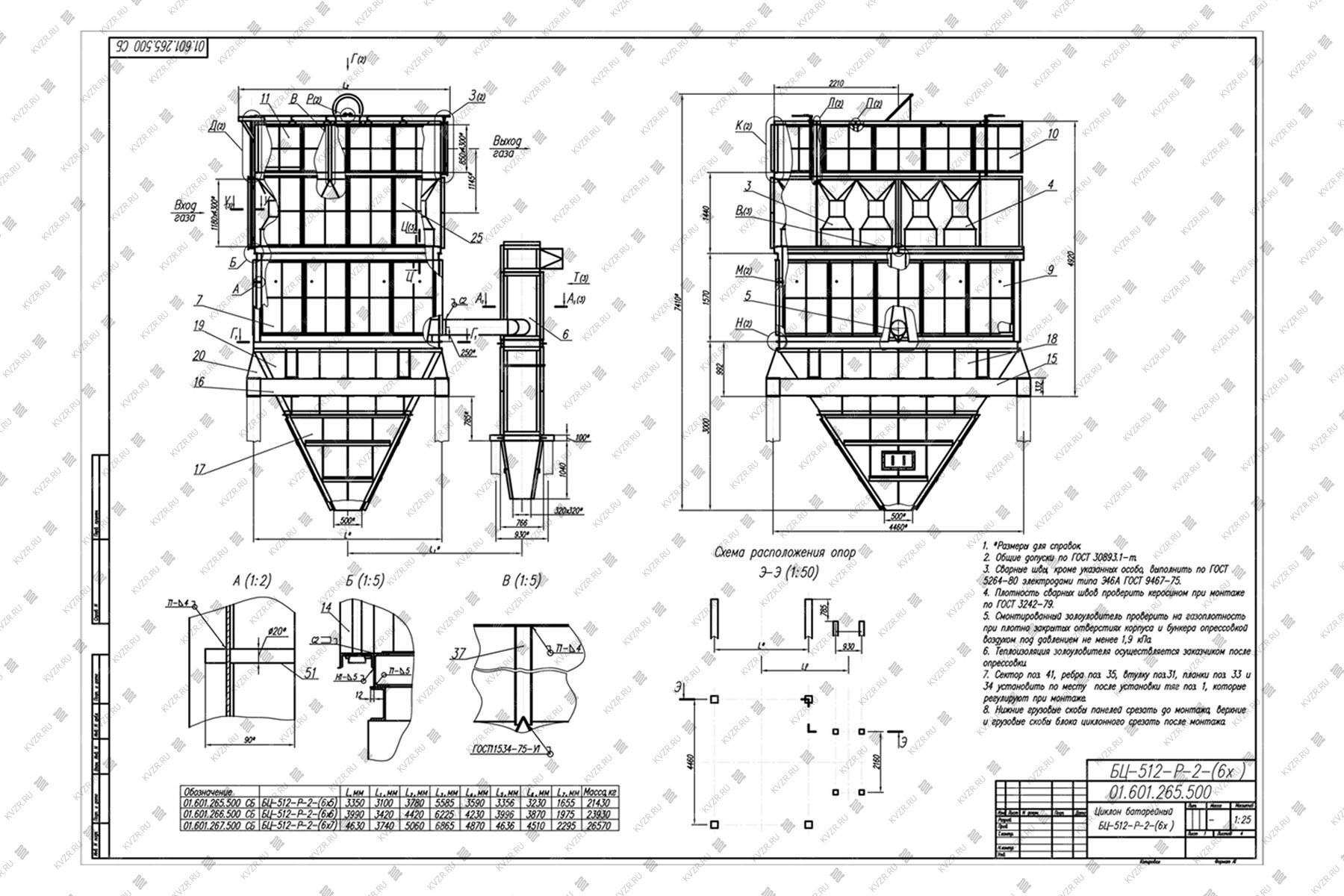 Агрегат БЦ 2 состоит из параллельно установленных чугунных циклонных элементов, объединенных в одном корпусе и имеющих общие подвод и отвод газов, а также сборный двухсекционный бункер.