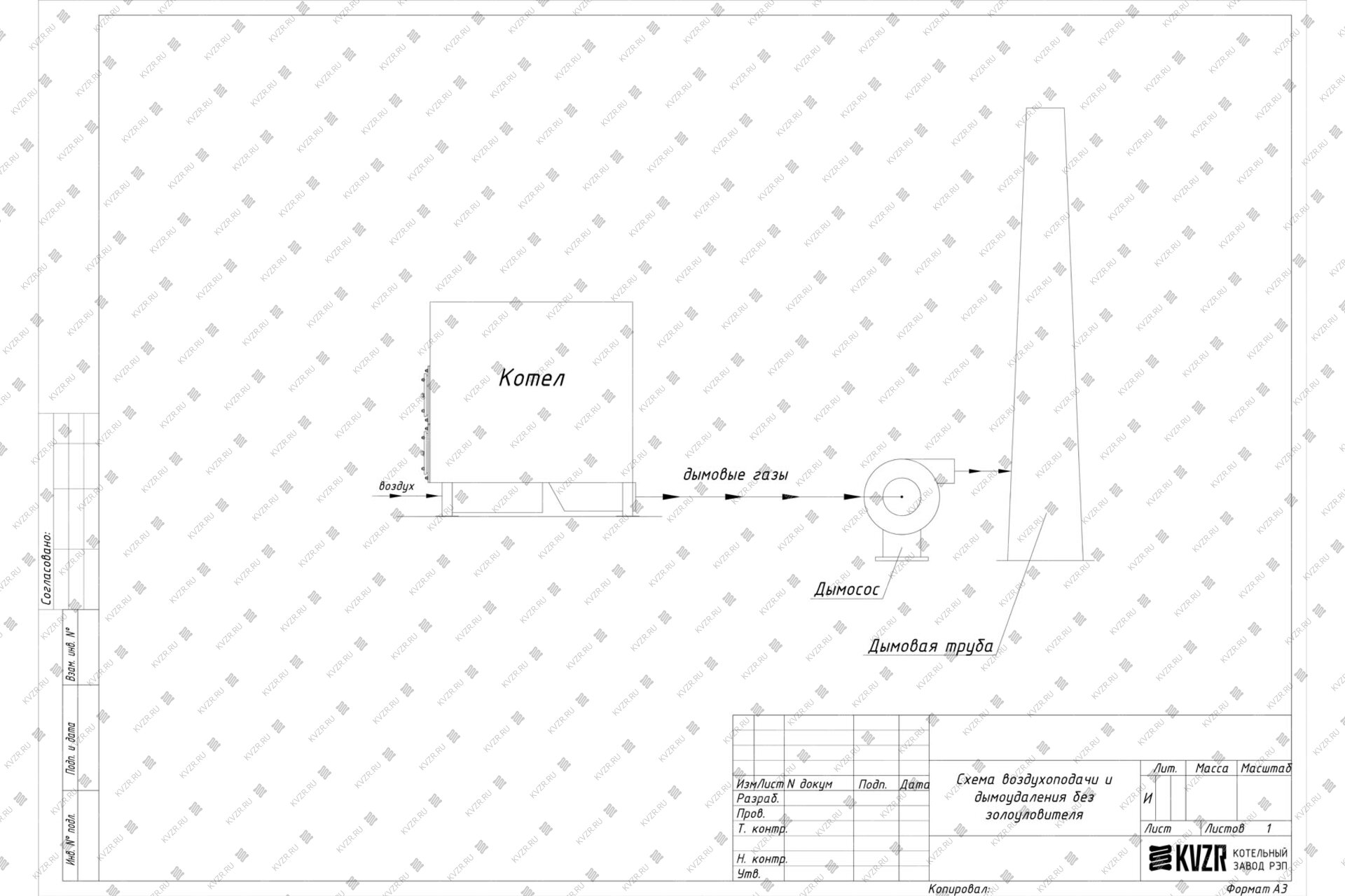 2. Горение: Воздух на горение твердого топлива подается принудительно дутьевым вентилятором. Интенсивность горения регулируется шибером на воздуховоде.